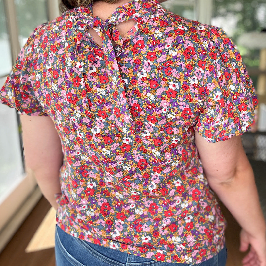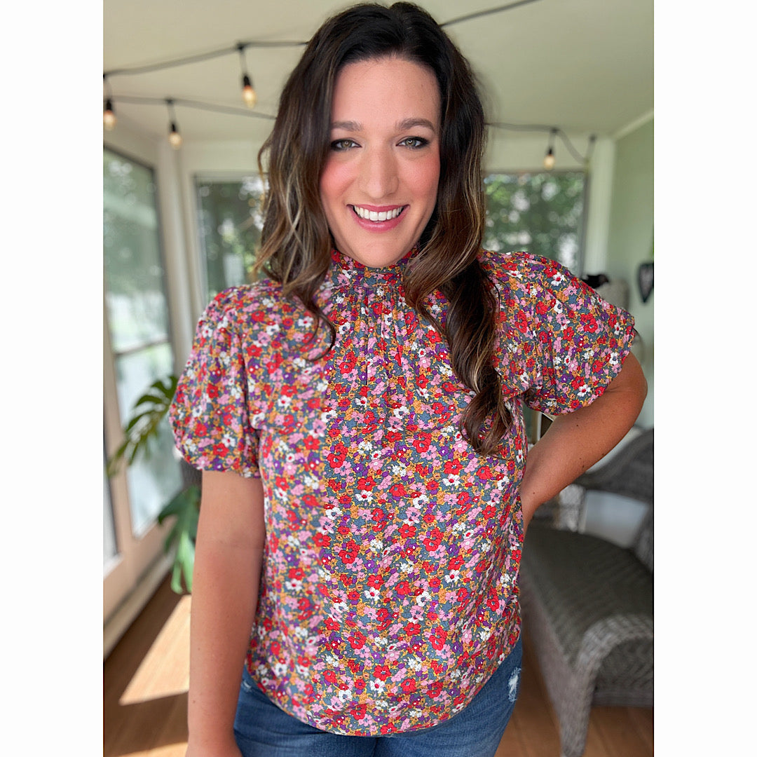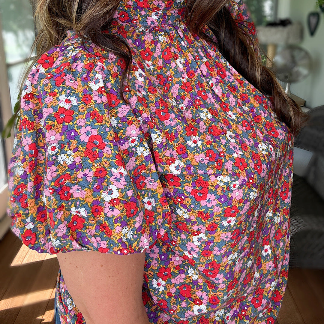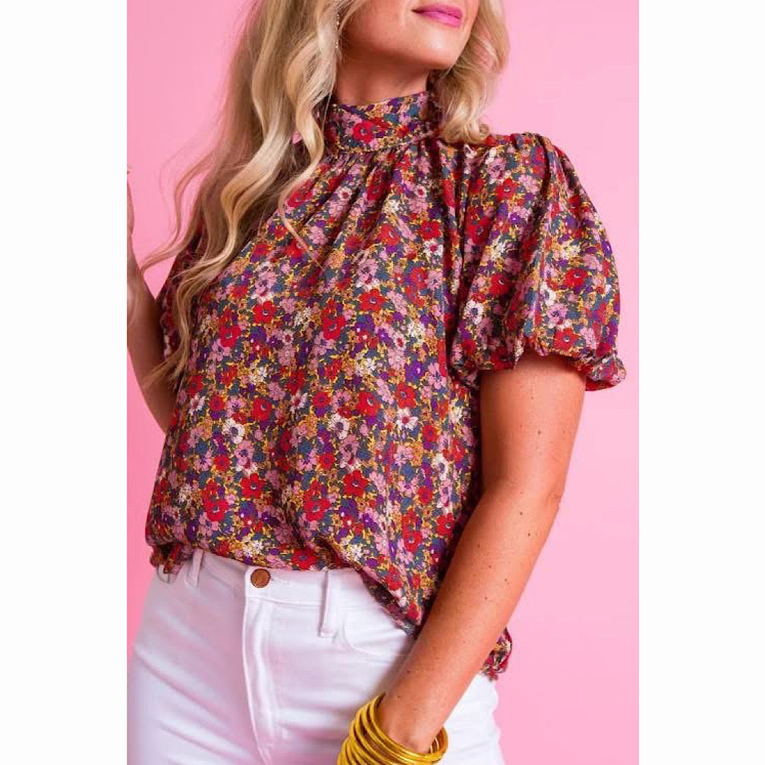 Elevate your wardrobe with the Evening Bloom Blouse, featuring a graceful high neck and a rich, dark floral print that transitions seamlessly through every season. Its sophisticated design pairs effortlessly with jeans for a casual-chic look or with a skirt for something more polished and elegant. Whether layered or worn solo, this blouse brings timeless charm and versatile style to your closet.