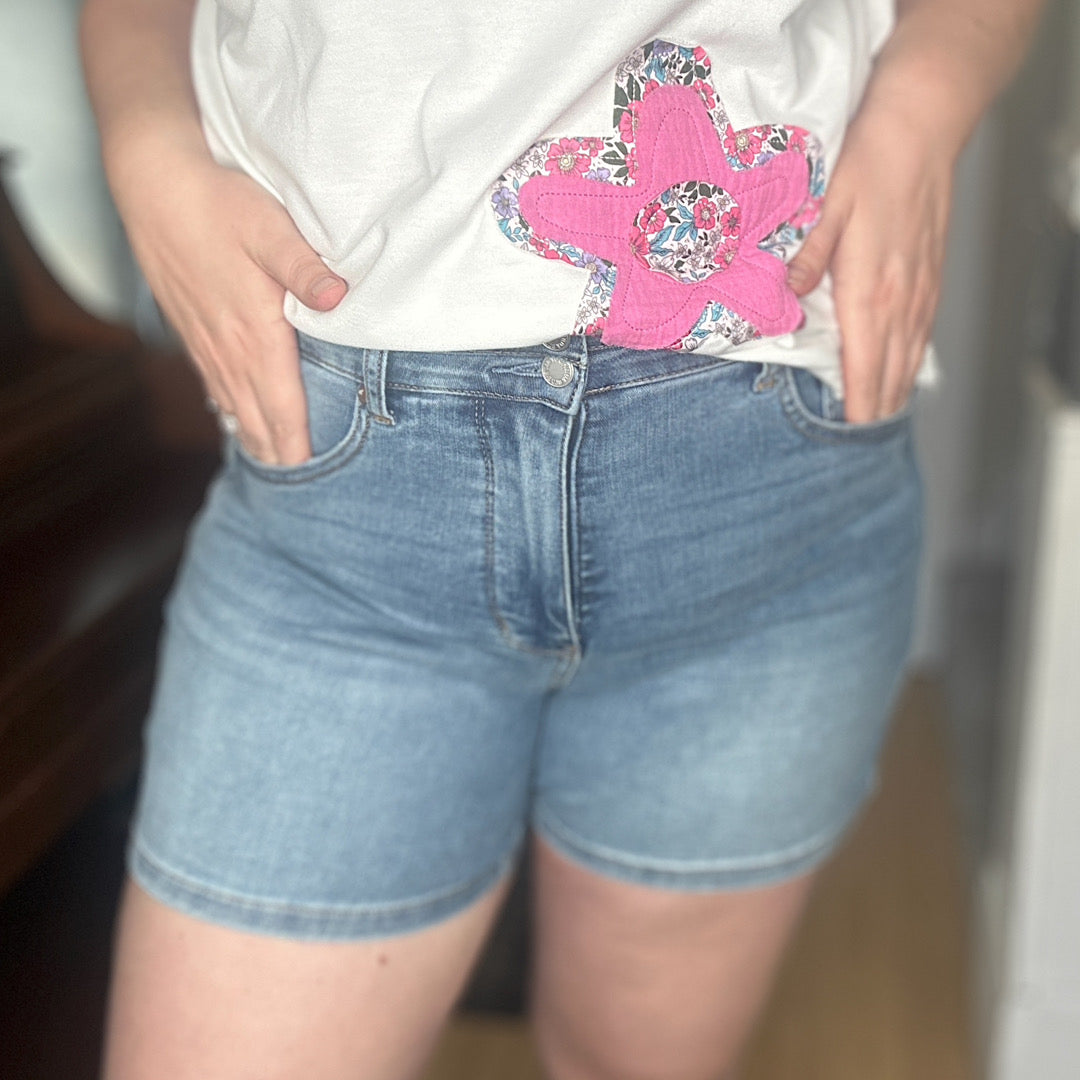 Meet your new go-to shorts—Flatter Me Denim Shorts! Designed with Judy Blue’s signature tummy control, these ultra-flattering shorts smooth and sculpt for the perfect fit. Stylish, comfy, and confidence-boosting—what more could you ask for? Oh yah! Did I mention they also have a moisture wicking material to help keep you cool this summer? SOLD.