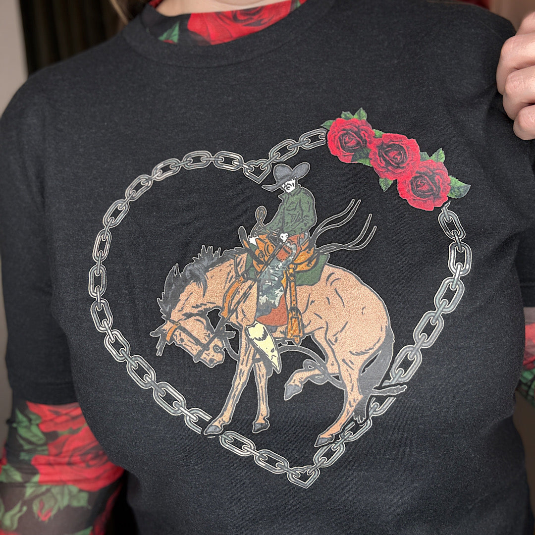 Bring a touch of western charm to your wardrobe with our Rose of My Heart Tee! This soft, comfortable tee features a bucking bronco and cowboy design set inside a camo chain heart, making it a playful nod to classic western style. Perfect for pairing with jeans or your favorite boots for a casual, country-inspired look.