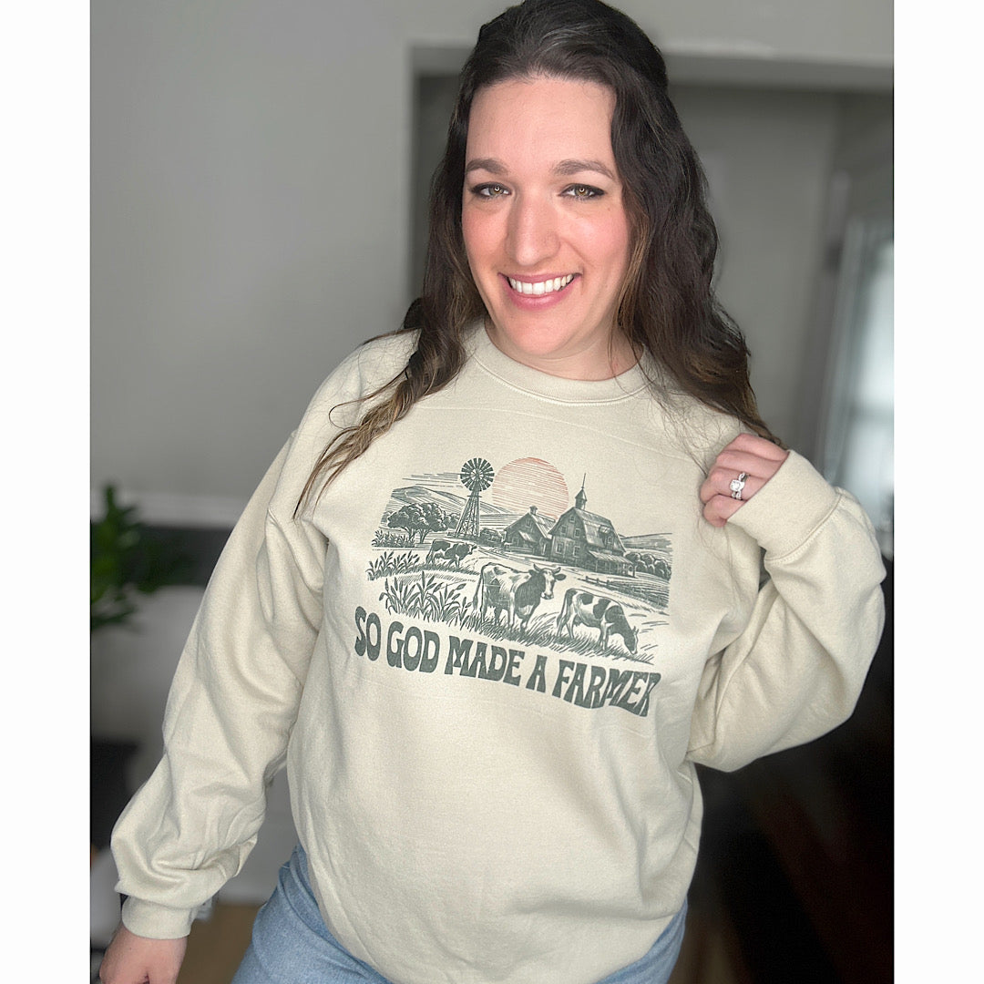 Honor the hardworking hands that feed the world with our So God Made A Farmer Crew. Featuring a breathtaking farm scene in the background and the powerful phrase “So God Made A Farmer,” this top is a tribute to the unsung heroes of the land. Whether you're in the field or out and about, wear it with pride and show your appreciation for the farming life. Plus, $5 from each purchase goes back to our local FFA—investing in the future of farming!