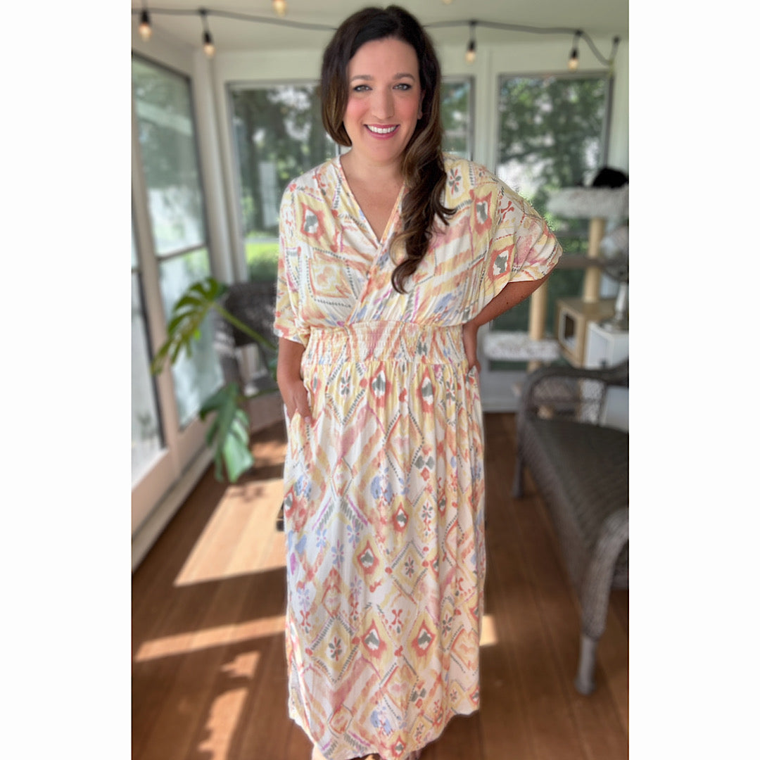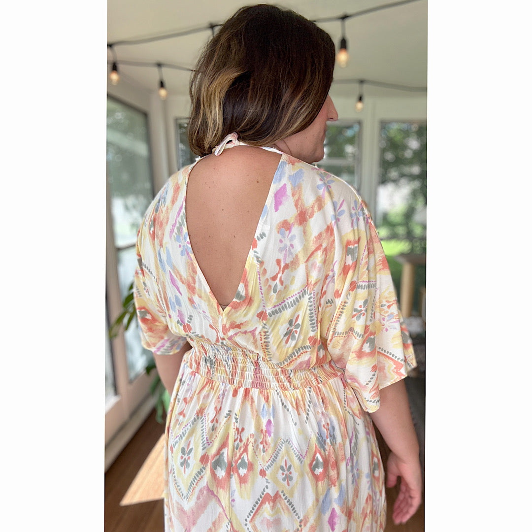 Embrace the warmth of the season with the Summer Glow Maxi, a flowing maxi dress featuring a delicate, pale multicolor geometric print. Lightweight and airy, this dress is your go-to for summer weddings, wedding & baby showers, or sunset strolls—effortlessly elegant and glowing with every step.